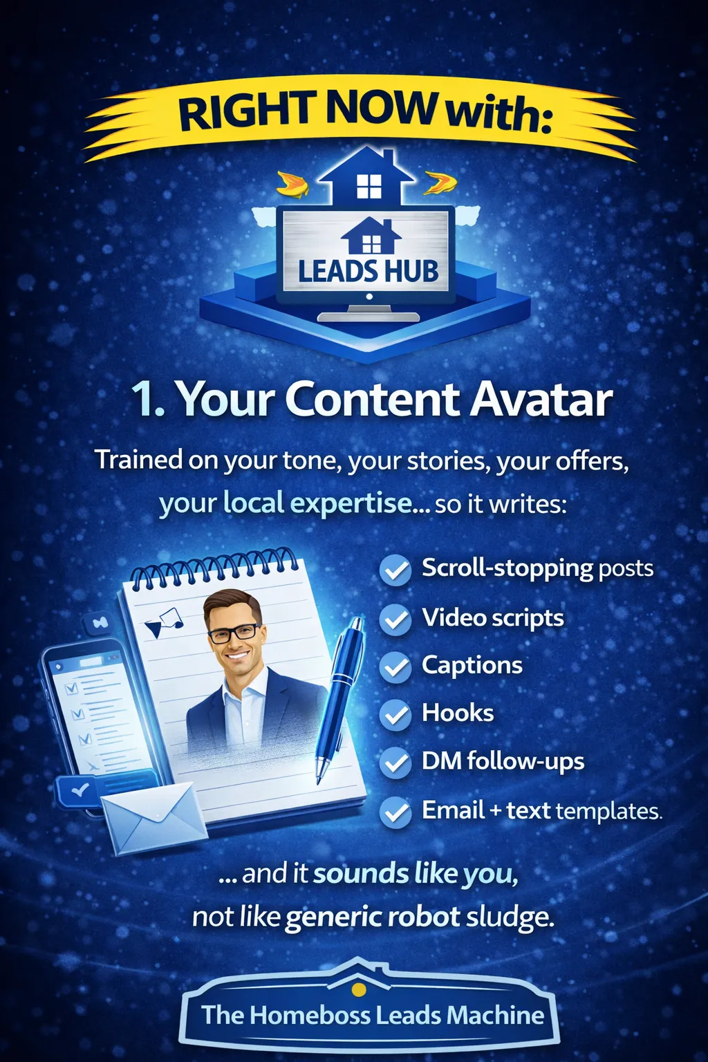 Your Content Avatar (your tone, your stories, your offers) ready to write posts + scripts.